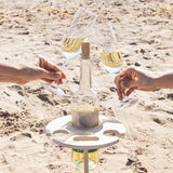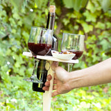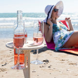 A folding, portable wine table for outdoors, ideal for enjoying some relaxing time in the best company with a good wine. The ideal solution so you don’t have to leave the wine, glasses or snacks on the floor, thereby preventing bugs, spills, dirt, etc. This original lime plywood table is robust, lightweight, easy and convenient to fold and unfold for use or for saving space to make it easier to transport and store. It can be easily be carried and set up on the beach, in the countryside, mountains, garden, etc. All you do is insert its single spike-shaped leg into the ground (soil or sand) and it provides a firm hold. It is easy to insert and to remove. Its flat support area features a hole in which to place a bottle of wine and two holes to place two wine glasses, still leaving space for a small bowl of snacks or aperitifs. It also features two more holes (one on the surface and another on the leg) which can be used to grip and handle it (one of them is also the carry handle). It is quick and easy to clean.