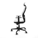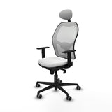 The office chair with headrest 1D036G1 from Piqueras y Crespo, model Jorquera, is specially designed to provide ergonomic comfort and functionality during work shifts of up to 8 continuous hours. This office chair in white stands out for its solid, durable frame, supporting a maximum weight of 120 kg, ensuring stability for various users. Its design features a fixed headrest and an adjustable lumbar support, essential for maintaining proper posture and preventing neck and lower back discomfort during extended use. The 1D adjustable armrests allow height adjustment to promote a comfortable, adaptable position, while the fixed backrest is complemented by a synchro mechanism with 5 tilt positions, enabling personalized recline angles for seat and backrest to enhance postural comfort. The seat has a reinforced PVC honeycomb structure interior with injected polyurethane foam of 50 mm thickness and 50 Kg/m³ density, offering a breathable surface that adapts to the body, optimizing comfort and avoiding heat buildup. The base is made of 5-spoke nylon with a 680 mm diameter, providing strength and smooth mobility, especially combined with 65 mm rubber-coated wheels for parquet floors, ensuring smooth movement without damaging the surface. Seat height adjusts between 48 cm and 61 cm, with a total chair height ranging from 121 cm to 129 cm, fitting various users and desks perfectly. It complies with UNE-EN-1335 standards and holds BIFMA certification, guaranteeing quality and safety for intensive use. Its white mesh and fabric finish, along with a simple, contemporary design, make it a versatile choice for work and study environments demanding ergonomic and durable solutions. In summary, the Jorquera chair with fixed headrest and adjustable armrests offers a practical, sturdy solution for those seeking an ergonomic, functional, and adaptable seat for demanding professional spaces.
