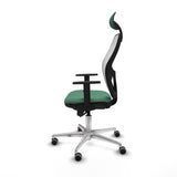 The Piqueras y Crespo 1D086G1 office chair with headrest is an ergonomic solution designed to provide comfort and functionality in work environments requiring up to 8 continuous hours of use. This office chair stands out for its adjustable and height-regulated seat, allowing customization between 48 and 61 cm, and its fixed backrest with fixed headrest combined with an adjustable lumbar support that helps maintain correct posture, relieving lumbar tension during long shifts. It features a 5-position synchro mechanism for synchronized seat and backrest tilt, offering versatility and comfort tailored to the user, along with 1D adjustable armrests that provide ergonomic forearm support. Its frame is reinforced with a polished aluminum 5-star base, 720 mm in diameter, ensuring stability, while 65 mm rubberized wheels designed for parquet floors allow smooth, silent movement without damaging surfaces. The seat includes high-density injected foam (50 mm, 50 Kg/m³) with a reinforced honeycomb interior, covered externally by 1 mm plastic, while the backrest has a PVC outer frame and breathable mesh finish that promotes airflow, keeping the user cool. Its design is modern and functional, presented in an emerald green color that adds a distinctive and attractive touch to any office or workspace. It supports a maximum weight of 120 kg, ensuring durability and robustness. This chair complies with UNE-EN-1335 standards, guaranteeing quality and ergonomic criteria. In summary, the Piqueras y Crespo Jorquera chair combines quality materials, ergonomic adjustment, and functional design to offer a comfortable and healthy working experience in professional settings.