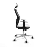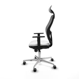 The office chair with headrest model 1D086G1 by Piqueras y Crespo is an ergonomic and functional solution designed for intensive work environments, ideal for shifts of up to 8 continuous hours. This sturdy chair supports a maximum weight of 120 kg and features a compact design that fits smaller desks without sacrificing comfort or stability. It includes a fixed headrest that provides extra support for the head, and an adjustable lumbar support that helps maintain correct posture and prevent discomfort from prolonged work. The combination of a fixed backrest with high-density injected foam (50 mm and 50 Kg/m3) ensures a solid and comfortable base for the user. Its 1D arms offer additional support, promoting a relaxed posture while working. The synchro mechanism allows adjustment of the backrest and seat tilt, with locking in 5 positions, while the seat height is adjustable between 48 cm and 61 cm, adapting to different heights and ergonomic preferences. The white mesh finish provides greater breathability, helping to maintain a comfortable temperature during use. The base is made of polished aluminum with 5 spokes and a diameter of 720 mm to offer maximum stability, equipped with 65 mm rubberized nylon wheels specially designed for parquet and other delicate floors, enabling smooth and quiet movement. Its structure, although lightweight (weighing 18 kg), is certified under the UNE-EN-1335 standard, guaranteeing quality and safety for office chairs. The seat combines a reinforced PVC honeycomb interior with injected polyurethane foam and a 1 mm thick durable plastic exterior, ensuring durability and comfort. In summary, the Jorquera chair with fixed headrest is a versatile and ergonomic piece, ideal for teleworking, offices, and professional spaces that require functional and durable furniture without compromising comfort.