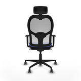 The office chair with headrest 1D036G2 from Piqueras y Crespo is an ergonomic solution designed to provide comfort and functionality in demanding work environments, suitable for continuous use up to 24 hours and supporting a maximum weight of 120 kg. This chair stands out for its structure, which includes a 2D adjustable headrest for optimal cervical support, a fixed backrest that ensures stability, and an adjustable lumbar support to maintain a healthy posture. Its height-adjustable and highly adjustable seat can be set from 48 to 61 cm, while the total height ranges from 121 to 134 cm, adapting to different users and needs. The 65 mm rubber-coated parquet wheels and the 5-spoke nylon base with a 680 mm diameter provide smooth movement and durability, facilitating fluid motion on any surface. The 1D armrests offer additional support and comfort for the upper limbs, complemented by the synchro mechanism with 5 positions that allows adjusting the backrest and seat tilt for a personalized experience. The seat features high-density injected foam (50 mm and 50 Kg/m³) on a reinforced PVC base with an internal polyurethane structure, ensuring durability and prolonged comfort, while the light blue velvet finish adds a sober and modern style that enhances any office or waiting room space. Its combination of materials, including mesh and fabric for a breathable design, prevents heat buildup and promotes ventilation, ideal for long shifts. Certified under the UNE-EN-1335 standard and with high-quality components such as a black lift piston and steel internal axles, this chair meets high safety and durability standards. Overall, the Jorquera chair represents a technical and ergonomic option for those needing a versatile and durable office chair with advanced lumbar and cervical support and adjustment features, suited for intensive professional use.