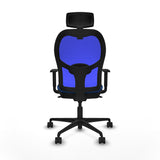 The Jorquera office chair with headrest by Piqueras y Crespo is an ergonomic solution designed to provide comfort and support during long work hours, with an intensive use capacity of 24 hours and a maximum supported weight of 120 kg. This blue chair features adjustable height, allowing the seat to be set between 48 and 61 cm to fit different heights and postures. It includes a 2D adjustable headrest that optimally adapts to the neck shape, as well as an adjustable lumbar support that promotes proper posture and reduces lower back fatigue. Its synchro mechanism with 5 locking positions simultaneously adjusts the tilt of the backrest and seat, offering a personalized and dynamic experience, while the backrest remains fixed to ensure stability. The 1D arms provide additional support and adapt to different positions, enhancing overall ergonomics. The seat is made with a reinforced PVC honeycomb inner structure and high-density injected polyurethane foam (50 mm and 50 Kg/m³) that delivers firmness and lasting comfort, covered with breathable mesh and blue faux leather that promotes ventilation and thermal comfort during prolonged use. The 5-star nylon base with a diameter of 680 mm and 65 mm nylon casters allow smooth and agile movement across various surfaces, complementing the chair’s functionality and mobility. It also holds quality and safety certifications such as UNE-EN-1335 and the BIFMA standard, ensuring its design complies with international ergonomics and durability regulations. Its combination of durable materials and a modern, functional design makes this office chair suitable for demanding professional environments as well as home use. In summary, the Jorquera combines versatility, ergonomics, and durability, making it a reliable option for those needing a height-adjustable desk chair with multiple adjustments to ensure comfort and support throughout the day.