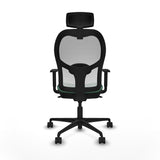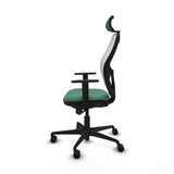 The Piqueras y Crespo office chair with headrest model 1D036N2 is a complete solution designed to optimize comfort and functionality in demanding work environments. This model, ideal for those needing a high-resistance ergonomic chair, features a frame with adjustable height and height regulation, allowing adaptation to different users and working postures. It includes 1D armrests that provide extra support for the arms during long shifts, helping maintain proper posture. The chair incorporates an adjustable headrest that supports the neck and head, enhancing overall comfort and promoting correct cervical alignment. Its backrest is fixed and complemented by an adjustable lumbar support, essential to prevent tension and fatigue in the lumbar area, highly valued in chairs for prolonged use. The breathable seat and backrest, thanks to their emerald green mesh/fabric finish, provide constant ventilation, reducing heat buildup and allowing a more pleasant user experience. The high-density injected foam (50 mm and 50 Kg/m3) offers an ergonomic padded surface that helps distribute pressure evenly, adding durability and comfort. It is designed for continuous 24-hour use with a maximum capacity of 120 kg, making it a robust and reliable chair. Its five-spoke nylon base with a 680 mm diameter and 65 mm wheels enable smooth and silent mobility on hard or carpeted floors. The synchro mechanism with five positions allows adjusting the tilt of the backrest and seat to individual needs, with locking at different angles that promote dynamic rest during work. Additionally, it features a black lift piston for easy height adjustments. With its functional design and elegant finish, this chair combines durability, ergonomics, and modern style, making it a solid choice for offices, study rooms, or spaces where comfort and durability are priorities. The Piqueras y Crespo 1D036N2 chair represents a balance between technical functionality and good design in the ergonomic chair segment for intensive work.