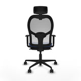 The seat has a reinforced interior made of PVC with high-density injected polyurethane foam (50 Kg/m³), ensuring lasting comfort and structural durability, while the exterior is made of durable plastic with a PVC frame on the backrest. Its finish in navy blue breathable mesh allows proper ventilation to help maintain freshness and prevent heat buildup during long hours of use. The base is made of 5-spoke nylon with a diameter of 680 mm, providing stability and strength; the wheels are 65 mm nylon with steel axles and bolts that ensure smooth and quiet movement on various surfaces. Seat height adjustment is done via a standard office lift piston, allowing easy adjustment from a minimum height of 48 cm to a maximum of 61 cm, while the total height ranges between 121 cm and 134 cm.
