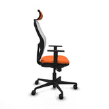 The Jorquera office chair with headrest by Piqueras y Crespo is an ergonomic solution designed to provide maximum comfort during long work shifts, with a recommended use of up to 24 continuous hours. This office chair in orange stands out for its adjustable height and 1D height-adjustable armrests, allowing posture adaptation to individual needs, promoting ergonomics and preventing discomfort. Its synchro mechanism with 5 positions adjusts the tilt of both the backrest and seat, offering flexibility to find the most comfortable working position. The 2D adjustable headrest provides extra neck support, complemented by an adaptive lumbar support that respects the natural spine curve and helps reduce muscle tension. The fixed backrest is made with a breathable mesh structure that ensures optimal ventilation, helping to stay cool even during extended use. The seat features a reinforced interior structure with 50 mm injected polyurethane foam at 50 Kg/m3 density, externally covered by high-resistance plastic, while the black 5-star nylon base with a 680 mm diameter ensures stability and durability, certified under BIFMA and UNE-EN-1335 standards. Its 65 mm nylon wheels with steel axles allow smooth and silent movement, facilitating mobility without damaging floors. The maximum load capacity is 120 kg and the total chair weight is 18 kg. Seat dimensions are 48 cm wide, with an adjustable height from 48 to 61 cm and a total height ranging between 121 and 134 cm, fitting users of different heights. This chair combines attractive design and advanced functionality, making it one of the most balanced options in terms of quality-price for those needing an operational chair with headrest and adjustable arms designed for long working hours.