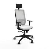 The office chair with headrest 1D066G1 from Piqueras y Crespo is a robust and functional option for professional environments requiring comfort and adaptability during long shifts. This model is designed for intensive use of up to 24 hours, supporting a maximum weight of 120 kg, ensuring durability and strength. Its structure features a 5-spoke 640 mm diameter nylon base with fiberglass, combined with a black semi-directional lift piston that allows a seat height adjustable between 46 and 53 cm, adapting to different users. It stands out for its Sincro/Traslack mechanism, which enables adjustable tilting of both backrest and seat with three-point locking and a 5 cm horizontal seat slide, providing a personalized ergonomic posture. The chair includes a fixed headrest and an adjustable lumbar support, contributing to proper spinal alignment and reducing fatigue during work. Its 1D armrests improve support and posture, while the backrest is made of 100% PES breathable mesh that promotes ventilation and helps maintain freshness. The seat consists of a laminated wood interior with high-density injected polyurethane foam (50 mm and 50 Kg/m3) for comfort and firmness, externally covered by 1 mm thick plastic for easy cleaning and maintenance. The 65 mm rubberized parquet wheels allow smooth and silent movement, ideal for office spaces with delicate floors. Its white finish gives it a simple and elegant design that fits various work settings. Additionally, this chair complies with UNE-EN-1335 standards, ensuring quality and safety in the sector. With a total width of 64.5 cm and a seat width of 51 cm, this piece is practical and versatile, perfect for those seeking an ergonomic solution with multiple adjustments to optimize comfort during long workdays. In summary, this office chair combines durability, ergonomics, and functionality in a sober design, intended for intensive professional use.