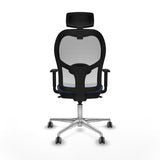 The Jorquera office chair with headrest by Piqueras y Crespo is a seat specially designed for those who require maximum comfort during long working hours, offering an ergonomic and durable solution for intensive use of up to 24 continuous hours. Supporting up to 120 kg, this office chair features a synchro mechanism that allows adjustment in 5 tilt positions for the backrest and seat, facilitating postural adaptation and promoting a healthy posture. It includes a 2D headrest that provides adjustable neck support, while the 1D lumbar support adapts to the natural curve of the back, minimizing muscle tension. Its 1D armrests offer stability and comfort, adjustable as needed. The frame has a fixed backrest and a sturdy seat with high-density injected foam (50 mm and 50 Kg/m³), ensuring comfort for hours and long-lasting durability. Additionally, its navy blue breathable mesh finish promotes ventilation, preventing heat and moisture buildup, ideal for continuous use environments. The polished aluminum base with 5 spokes and a diameter of 720 mm ensures stability, while the 65 mm rubber-coated nylon wheels are silent and suitable for delicate floors like parquet. The seat height is adjustable between 48 and 61 cm, allowing adaptation to different desk types and users. The modern and elegant design of the Jorquera adds a professional and functional aesthetic, making it a versatile choice for demanding offices or workspaces seeking quality and ergonomics. Overall, this chair represents a balance between advanced technical support, durable materials, and ergonomic comfort designed for professional users.