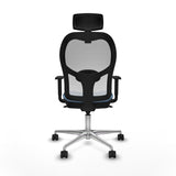 The Jorquera office chair with headrest from Piqueras y Crespo is an ergonomic and durable solution designed for intensive use up to 24 hours a day, ideal for those who need comfort during long work shifts. This chair features a synchronised mechanism with 5-position lock that allows simultaneous adjustment of the backrest and seat tilt, while the height is fully adjustable, adapting to different users. It includes a 2D adjustable headrest and an ergonomic lumbar support that provide optimal neck and back support, reducing the risk of muscle discomfort. The 1D armrests offer additional arm support, improving posture. The seat and backrest have a reinforced internal frame and high-density injected polyurethane foam (50 mm and 50 Kg/m³), ensuring prolonged comfort and durability. The upholstery combines mesh and sky blue fabric that promotes breathability, keeping the user cool during use. Its design includes a polished aluminum five-star base with a diameter of 720 mm, equipped with 65 mm silent nylon casters for smooth and safe movement on any office surface. This chair supports a maximum weight of 120 kg and complies with UNE-EN-1335 standards, certifying its quality and user safety. Its combination of mesh and fabric finish, along with chrome details and a sturdy frame, positions it as a technical and reliable option for demanding professional environments. Overall, the Jorquera chair with headrest offers a balanced mix of adaptability, advanced lumbar support, and materials designed for lasting comfort in continuous workspaces. This model represents a functional and certified alternative within the high-resistance ergonomic office chair segment.
