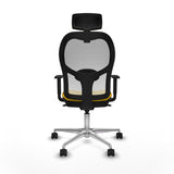 The office chair with headrest 1D086N2 from Piqueras y Crespo is a model designed to offer a high level of comfort and functionality in demanding work environments, especially suitable for extended remote work. This office chair in yellow features a breathable mesh seat and backrest that promote ventilation, maintaining a comfortable temperature during long workdays. Its synchro mechanism with five tilt positions allows simultaneous adjustment of the backrest and seat to suit different postures, while the height is adjustable between 48 and 61 cm, ensuring proper ergonomics for various users. It includes an adjustable 2D headrest that provides optimal neck support and a 1D lumbar support that helps maintain correct posture in the lower back area, reducing muscle fatigue. The 1D armrests offer comfortable forearm support, ideal for computer work. Its polished aluminum five-star base with a diameter of 720 mm ensures stability and durability, while the 65 mm nylon wheels allow smooth and quiet movement within the workspace. The seat consists of an interior reinforced with PVC honeycomb and injected polyurethane foam of 50 mm thickness and 50 Kg/m3 density, providing exceptional comfort and prolonged ergonomic adaptability. Its structure is certified under the UNE-EN-1335 standard, guaranteeing strict compliance with ergonomics and safety. Weighing 18 kg in total, this chair combines lightness and robustness, supporting users up to 120 kg. Thanks to its functional design and quality materials, this chair is an ideal solution for teleworking spaces, suitable for both adults and teenagers who value the combination of ergonomics, durability, breathability, and personalized adjustment in a product for intensive use. The Jorquera chair is, ultimately, a versatile and technical option adapted to the current needs of remote work.