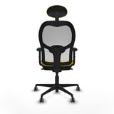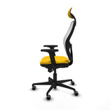 The Jorquera 2D036G1 office chair by Piqueras y Crespo is designed to combine comfort, ergonomics, and functionality for intensive work sessions of up to 8 hours. It features a fixed headrest and fixed backrest that provide stability and constant support, complemented by an adjustable lumbar support to promote correct posture and reduce back and neck fatigue. The frame includes 2D adjustable armrests for height and angle, offering precise adaptability to user needs, while the 5-position synchro mechanism allows safe reclining and maintaining various positions for personalized comfort. Its seat is made with high-density injected foam (50 mm, 50 Kg/m3) over a reinforced PVC and polypropylene core, ensuring durability and prolonged comfort, with a resistant plastic outer finish for added protection. The backrest combines a PVC outer frame with breathable mesh in yellow, enhancing ventilation and preventing heat buildup during long work periods. The 5-spoke nylon base with a 680 mm diameter provides stability and safety, while the 65 mm rubberized nylon wheels ensure smooth and quiet movement, especially suitable for parquet floors. This chair supports a maximum weight of 120 kg and offers seat height adjustment from 48 to 61 cm, with a total height adjustable between 121 and 129 cm, adapting to different heights and ergonomic needs. Certified according to UNE-EN-1335 and with BIFMA-certified components, the Jorquera is a modern solution for office environments requiring a balance of design, functionality, and durability for intensive long-hour use. Its mesh and fabric finish, combined with vibrant yellow color, adds a distinctive and contemporary touch to any workspace. In short, this office chair is a solid choice for those seeking an ergonomic, functional, and durable product for professional settings.