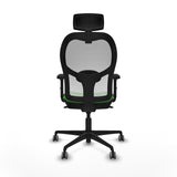 The office chair with headrest 2D036G2 from Piqueras y Crespo is an ergonomic solution designed to provide comfort and functionality in demanding work environments. This Jorquera model is built for intensive use of up to 24 continuous hours, making it ideal for meeting rooms, reception areas, or operational workstations requiring durability and prolonged comfort. Its structure with a 5-spoke nylon base measuring 680 mm in diameter, combined with a black gas lift, ensures certified robustness according to UNE-EN-1335 and supports up to 120 kg. The 48 cm wide seat features a reinforced PVC core and high-density injected polyurethane foam (50 mm thickness, 50 Kg/m3), finished in breathable green mesh that promotes ventilation and prevents heat buildup during long workdays. The backrest is fixed, with an outer PVC frame and an adjustable-height headrest providing extra cervical support. The 2D armrests allow two-dimensional adjustment to suit different resting or working positions, while the synchro mechanism offers 5 locking positions to adjust the tilt of both backrest and seat, facilitating an ergonomic posture adapted to the task. Seat height adjusts between 48 and 61 cm, and total height ranges from 121 to 134 cm, enabling compatibility with various desks or tables. The 65 mm rubber-coated nylon casters, with high-strength steel axles and bolts, ensure smooth and quiet movement, especially suitable for delicate floors like parquet. The elegant, contemporary design of the Jorquera combines quality materials that extend the chair’s durability while maintaining a professional, modern appearance. In summary, this chair offers a balance of ergonomics, durability, and functionality, making it a solid choice for work environments demanding constant comfort and customizable adjustments for different usage scenarios.