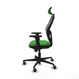 The Jorquera office chair, model 2D036G2 by Piqueras y Crespo, is an ergonomic and functional solution designed to provide comfort in demanding work environments, ideal for intensive use up to 24 hours. Presented in an attractive green finish, this chair features an adjustable 2D headrest that offers essential neck support, promoting correct posture during long shifts. Its 2D armrests allow adjustment of both height and angle, enhancing ergonomics and reducing shoulder and arm strain. The backrest is fixed but includes an adjustable 1D lumbar support that ensures targeted support for the lower back, helping to prevent discomfort and maintain postural health. The seat height is adjustable between 48 and 61 cm, adapting to different heights and desks, while the total height ranges from 121 to 134 cm. The frame rests on a five-spoke nylon base with a diameter of 680 mm, equipped with 65 mm rubberized wheels specially designed for parquet floors, enabling smooth and quiet movement on delicate surfaces. The seat combines a reinforced interior with injected high-density polyurethane foam (50 mm and 50 Kg/m³) for greater comfort and durability, covered with breathable mesh fabric that promotes ventilation, keeping a fresh feel during extended use. The synchro mechanism with 5-position lock offers multiple tilt options for the backrest and seat, allowing posture customization according to user needs, and supports a maximum weight of 120 kg. This model holds UNE-EN-1335 certification and meets quality and safety standards, making it a robust and ergonomic choice for home offices, call centers, or workplaces demanding continuous comfort and functionality. Overall, the Jorquera 2D036G2 combines adaptability, specialized support, and refined finishes to facilitate an efficient and healthy work experience.