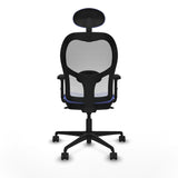 The 2D036N1 office chair with headrest from the brand Piqueras y Crespo is an ergonomic solution designed to provide comfort and functionality during long workdays of up to 8 hours. Its structure includes a fixed headrest and an adjustable lumbar support that promote proper posture and reduce neck and back fatigue, essential for continuous use. This office chair features a fixed backrest made of a PVC frame covered with fabric and breathable mesh in light blue, offering ventilation and preventing heat buildup. The seat, with a high-density injected polyurethane foam core (50 mm and 50 Kg/m³), ensures prolonged comfort thanks to its firmness and adaptability, while its 1 mm thick plastic frame provides durability and strength. With a maximum capacity of up to 120 kg, it has a synchro mechanism with 5 adjustment positions, allowing the backrest and seat tilt to be adapted to the user’s individual needs. Additionally, it includes a 2D armrest system with height and angle adjustment to provide extra arm support, promoting proper ergonomics during work. The seat height is adjustable, ranging from 48 to 61 cm, and the total adjustable height goes from 121 to 129 cm, facilitating adaptation to different users and desk types. The base consists of a gas lift and five nylon spokes with 65 mm wheels that ensure smooth and silent movement on flat surfaces. This chair, certified under the UNE-EN-1335 standard and with BIFMA-approved components, combines quality materials with a contemporary design that fits any professional environment. Its mesh and fabric finish makes it a breathable and fresh option, especially suitable for those requiring durability and comfort in demanding office settings. In short, the Jorquera chair by Piqueras y Crespo represents an anatomical and sturdy alternative that meets ergonomic and functional demands in intensive workspaces.