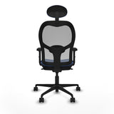 The Jorquera office chair with headrest from Piqueras y Crespo is designed to provide functionality and comfort during long work or study sessions, supporting intensive use of up to 8 hours daily. This office chair features adjustable and height-regulated seating to fit different users, with a seat height range from 48 cm to 61 cm and an overall height between 121 cm and 129 cm. It includes a fixed headrest offering additional ergonomic neck support, along with an adjustable lumbar support that adapts to the natural curve of the spine to prevent discomfort during extended periods. Its 2D adjustable armrests allow height and angle modifications to help maintain proper posture, reducing shoulder and arm strain. The 5-position synchro mechanism enables synchronized adjustment of the backrest and seat, allowing angle customization and enhanced dynamic comfort during use. The fixed backrest, with an outer PVC frame and breathable mesh upholstery, ensures optimal ventilation to keep the user cool. The seat is made with injected foam of 50 mm thickness and 50 kg/m³ density, covered in a mesh and fabric blend that provides durability and lasting comfort. Its black nylon five-star base with a 680 mm diameter and 65 mm nylon casters guarantee stability and silent mobility on various surfaces. The chair supports up to 120 kg, certified under UNE-EN-1335 standards, with robust components such as a steel internal shaft and lift piston in the mobility mechanisms. The navy blue finish adds an elegant touch, suitable for modern offices or study spaces. Its structure designed for intensive use and ergonomic design make it a versatile solution combining functionality, comfort, and durability for demanding work environments. The Jorquera by Piqueras y Crespo is a technical and tailored option for those needing a high-quality chair that promotes correct posture and a healthy workspace.