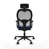 The office chair with headrest 2D036N2 from Piqueras y Crespo is a model designed to provide an ergonomic and functional solution for intensive workspaces, suitable for continuous use of up to 24 hours and with a maximum support capacity of 120 kg. It features a 2D adjustable headrest that allows adapting cervical support to the desired position, along with an adjustable lumbar support to maintain posture and relieve lower back tension. The synchro mechanism with five positions enables combined adjustment of the backrest and seat, enhancing ergonomics throughout the workday. This chair includes 2D adjustable armrests in height and angle for personalized forearm support, as well as a seat height adjustable between 48 and 61 cm, allowing adaptation to different users and desks. The backrest, although fixed, is made with a PVC frame covered in breathable mesh that ensures proper ventilation and prolonged comfort. The seat, with a reinforced PVC interior and injected high-density polyurethane foam (50 mm and 50 Kg/m³), offers firm and durable support with a plastic outer finish for resistance and easy cleaning. The five-star base is made of sturdy nylon with a diameter of 680 mm, mounted on 65 mm nylon wheels that provide smooth and quiet movement. Additionally, the chair holds BIFMA and UNE-EN-1335 certifications that guarantee its quality and safety, featuring a modern blue design that adds a professional and versatile touch to any office or remote work environment. Ideal for those seeking a breathable office chair with armrests and adjustable height that combines advanced ergonomics and functionality for long hours at the computer.
