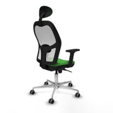 The Jorquera office chair by Piqueras y Crespo is an ergonomic solution designed to support intensive work shifts of up to 8 hours. This model combines functionality and comfort, featuring a fixed headrest that provides extra cervical support and an adjustable lumbar support to help maintain proper posture, reducing potential back discomfort. Its sturdy frame supports a maximum weight of 120 Kg, ensuring durability and strength, while the seat and backrest have high-density injected foam padding (50 Kg/m³) for long-lasting comfort without losing shape. The chair has a fixed backrest with a PVC frame and a green breathable mesh finish that promotes ventilation, ideal to prevent heat buildup during long sessions. Equipped with a 5-position synchro mechanism, it allows synchronized adjustment of the backrest and seat tilt to suit user preferences. Additionally, it includes 2D adjustable armrests in height and angle, enhancing support and ergonomics. Its polished aluminum 5-star base with a 720 mm diameter and 65 mm rubber-coated nylon wheels for parquet floors enable smooth and quiet movement while protecting the flooring. The seat height adjusts between 48 and 61 cm, allowing personalized fitting. With a modern and functional design, this chair is suitable for both professional environments and home offices, making it a versatile option for those seeking comfort, support, and durability in an office chair with integrated headrest and armrests. This combination of features positions the Jorquera model as a balanced and practical product for prolonged work.