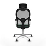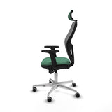 The office chair with headrest 2D086G2 from Piqueras y Crespo is a model specially designed for intensive use of up to 24 hours daily, making it an ideal solution for professionals who require prolonged comfort and durability. This ergonomic seat in emerald green features an adjustable height from 48 to 61 cm and a total height ranging between 121 and 134 cm, allowing posture adaptation to different desk types and heights. It is equipped with 2D adjustable arms that allow height and angle adjustment to ensure optimal forearm support. Its synchro mechanism with 5 locking positions facilitates coordinated tilting of the backrest and seat, enhancing ergonomics and encouraging movement during the workday. The adjustable headrest provides additional cervical support, while the fixed backrest is built with a PVC outer frame designed to offer stability and comfort without losing firmness. The seat structure combines a PVC honeycomb-reinforced interior with high-density injected polyurethane foam (50 mm thick and 50 Kg/m³), ensuring adaptability that reduces pressure and promotes a comfortable experience. The chair is breathable thanks to a combination of mesh and fabric in its finish, improving ventilation and keeping the user cool during long hours. Additionally, it features a polished aluminum 5-star base with a 720 mm diameter, along with a chrome lift piston and 65 mm rubber-coated nylon wheels designed specifically to protect delicate floors such as parquet. Its UNE-EN-1335 certification guarantees compliance with key safety and ergonomic standards, reinforcing its quality and reliability. Weighing 18 kg and supporting users up to 120 kg, the Jorquera chair is a technical and sturdy option for workspaces requiring comfort, functionality, and durability.