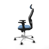 The 2D086G2 office chair with headrest from Piqueras y Crespo is an ergonomic and functional option designed for intensive professional use, ensuring comfort during shifts of up to 24 consecutive hours. This model stands out for its structure with 2D adjustable arms, allowing height and angle adjustment for optimal arm support, and an adjustable headrest that provides extra cervical support, improving posture and reducing fatigue. Equipped with a 5-position synchro system, it facilitates natural movement of the backrest and seat with locking at various angles, optimizing postural adaptation. The seat height is adjustable, ranging from 48 to 61 cm, while the total height varies between 121 and 134 cm, allowing customization according to user height and preferences. Its backrest is fixed for stability but includes an adjustable lumbar support to keep the lower back properly aligned. The seat combines a high-density injected polyurethane foam interior (50 Kg/m3) with 50 mm thickness and an outer finish of reinforced plastic for durability and resistance to continuous use. The backrest features an outer PVC frame and a breathable mesh/fabric surface in sky blue, promoting ventilation and preventing heat buildup. The polished aluminum base with 5 spokes and a diameter of 720 mm provides solidity and stability, while the 65 mm rubber-coated nylon wheels are designed for quiet and smooth rolling, ideal for parquet floors. Its maximum load capacity is 120 kg, fitting a wide range of users. Additionally, this chair meets UNE-EN-1335 certification, ensuring European standards in design and ergonomics. Weighing 18 kg in total, it is a robust yet manageable product. The combination of technical features and quality materials makes this chair a suitable solution for those demanding comfort, personalized adjustment, and durability in demanding office environments, maintaining an attractive and sober design in sky blue. This chair is especially recommended for professionals seeking a seat that combines ergonomic support, precise adjustments, and durability for prolonged use.