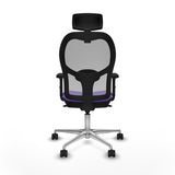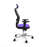 The office chair with headrest 2D086N2 from Piqueras y Crespo is furniture designed to provide comfort and functionality during intensive work shifts, even up to 24 hours of continuous use. This high reception chair features a 2D adjustable headrest that offers extra neck support and a adjustable lumbar support to help maintain proper ergonomic posture. Its fixed backrest ensures stability, and the seat, with a reinforced honeycomb PVC interior and high-density injected polyurethane foam (50 mm and 50 Kg/m3), guarantees exceptional comfort during long sessions. The chair includes 2D armrests that provide adaptable support for different positions, and a 5-position synchro mechanism allowing combined adjustment of the backrest and seat tilt to suit user needs. Additionally, it has a chrome lift piston for precise seat height adjustment, ranging from 48 to 61 cm, while the total height adjusts between 121 and 134 cm. Its base consists of a sturdy polished aluminum 5-star base with a 720 mm diameter, complemented by 65 mm nylon wheels that ensure smooth and quiet movement on any office surface. The outer structure combines mesh and fabric in lilac, offering a simple yet elegant and breathable design that improves ventilation and prevents heat buildup. With a maximum capacity of 120 kg and a total weight of 18 kg, this chair complies with the UNE-EN-1335 certification, essential standards for office chairs regarding safety and quality. Its construction stands out not only for functionality and durability but also for adapting to various environments, from professional offices to home spaces, providing an ergonomic and practical solution for users needing durable, adjustable, and comfortable furniture for work or prolonged activities like knitting. In summary, the Jorquera chair by Piqueras y Crespo represents a balanced choice between design, comfort, and technical features for demanding users.