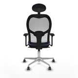 The office chair with headrest 3D086G1 from Piqueras y Crespo is designed to provide comfort and functionality in demanding workspaces. This model, known as Jorquera, is intended for intensive use up to 24 hours, supporting a maximum weight of 120 kg, ensuring robustness and durability suitable for professional environments. Its design features a fixed headrest that offers stable head support, combined with an adjustable lumbar support to help maintain ergonomic posture during long shifts. The chair includes 3D armrests allowing adjustment of both height and angle for a personalized fit tailored to individual user needs. Additionally, the 5-position synchro mechanism enables tilting of the backrest and seat with lockable angles, optimizing comfort and body alignment. Key materials include a breathable mesh and fabric structure in light blue, promoting ventilation and preventing heat buildup, while the high-density injected foam (50 mm and 50 Kg/m³) in the seat ensures durable and comfortable padding. The polished aluminum five-star base, with a diameter of 720 mm, and 65 mm nylon rubber-coated wheels designed for parquet floors guarantee smooth and silent mobility without damaging surfaces. The seat height is adjustable between 48 and 61 cm, with an overall chair height ranging from 121 to 129 cm, allowing perfect adaptation to different users and desks. The modern, functional design of this chair, certified under UNE-EN-1335, combines strength and ergonomics through a fixed backrest that provides stability and a finish that is elegant and practical for contemporary offices. In short, the Piqueras y Crespo Jorquera office chair offers a balanced combination of technical features and comfort, designed for those needing a reliable and adjustable solution for teleworking or office use over extended periods.
