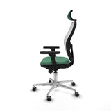 The Jorquera 3D086G2 office chair from Piqueras y Crespo is a complete solution for those who need ergonomic and durable furniture for extended workspaces. This model, designed for intensive use up to 24 hours, supports a maximum weight of 120 kg and features a 2D adjustable headrest and a 1D adjustable lumbar support, providing optimal cervical and dorsal support to help prevent discomfort during long shifts. The frame combines a fixed backrest with a seat reinforced with high-density injected polyurethane foam (50 mm thick and 50 kg/m3), ensuring superior comfort during continuous use. Its 3D adjustable armrests allow height and angle modifications to adapt support to the user’s specific needs. Additionally, the synchro mechanism with 5 locking positions offers flexibility to find the right posture, combining backrest and seat tilt with seat height adjustment ranging from 48 to 61 cm, also adjusting the total chair height from 121 to 134 cm. The chair features a breathable emerald green mesh finish that promotes airflow, enhancing thermal comfort and preventing moisture buildup, ideal for intensive work environments. The polished aluminum five-star base with a diameter of 720 mm provides stability, while the 65 mm rubber-coated nylon wheels, designed for parquet floors, ensure quiet and smooth movement without damaging the surface. The combination of high-quality materials, UNE-EN-1335 certification, and modern design makes this chair not only meet functional requirements but also add aesthetic value to any workspace, suitable for teleworking, studying, or continuous office use. In short, the Jorquera 3D086G2 office chair is a technical and durable option, designed for demanding users who value ergonomics, flexibility, and design in their daily tools.