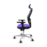 The 3D086G2 office chair with headrest from Piqueras y Crespo is designed for work environments that demand comfort and durability during long use periods. It is an operational chair especially suited for intensive use up to 24 continuous hours, supporting a maximum weight of 120 kg thanks to its sturdy frame and high-quality components. It features a headrest adjustable in two dimensions which, together with lumbar support, helps maintain proper ergonomic posture and reduce back fatigue during extended workdays. The seat height is adjustable between 48 and 61 cm, allowing adaptation to different users and work desks, while the total height ranges from 121 to 134 cm. The 3D armrests can be adjusted in height and angle, providing personalized forearm support and improving postural comfort. Its synchro mechanism with five positions allows reclining and adapting the seat and backrest to the user’s dynamic needs, with secure locking in each position. The fixed backrest has an outer PVC frame and a breathable mesh surface that promotes airflow, while the seat combines a 50 mm injected polyurethane foam interior with a density of 50 Kg/m3 and a plastic exterior that enhances durability and comfort. The base is made of polished aluminum with 5 spokes and a diameter of 720 mm, offering stability and a modern design. The 65 mm rubberized wheels, with nylon cores and steel axles, enable quiet and smooth movement on parquet floors and other delicate surfaces. This model also includes a footrest, adding extra comfort and relaxation during the workday. With an approximate total weight of 18 kg and UNE-EN-1335 certification, it meets European quality and ergonomic standards. Its lilac color adds a touch of distinction and modernity to the workspace, combining functionality and aesthetics. In short, the Jorquera chair by Piqueras y Crespo is a complete solution for those needing an adaptable, ergonomic office chair capable of supporting intensive professional use with guaranteed comfort and durability.