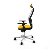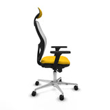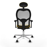 The office chair with headrest 3D086N1 by Piqueras y Crespo is a model specially designed to provide ergonomic comfort and functionality in demanding work environments. Designed for intensive use up to 24 hours, this task chair features a sturdy construction capable of supporting a maximum weight of 120 kg, ensuring durability and consistent strength. Its fixed headrest and adjustable lumbar support improve posture, reducing back strain during long shifts. Notable are its 3D armrests, which allow height and angle adjustment, offering support tailored to the user’s needs. The five-position synchro mechanism enables synchronized tilting of the backrest and seat, optimizing ergonomics and personalizing the seating experience. The seat includes high-density injected foam (50 kg/m³) with a 50 mm thickness, providing lasting comfort and proper pressure response, while the backrest is covered with a PVC outer frame and breathable mesh finish that promotes ventilation and keeps freshness. The polished aluminum five-star base, with a diameter of 720 mm, offers stability and strength, complemented by 65 mm nylon casters that ensure smooth and quiet movement on various surfaces, with an option for locking wheels for added safety. Additionally, the adjustable seat height (from 48 to 61 cm) and total height adjustable between 121 and 129 cm allow adaptation to different desk types and users. The yellow color design adds a vibrant and distinctive touch, easily integrating into modern spaces requiring both style and function. This chair meets the UNE-EN-1335 certification, supporting its quality and compliance with office furniture standards. Overall, the Jorquera model represents an ergonomic, practical, and durable solution suitable for professionals demanding comfort and support during long working hours.