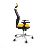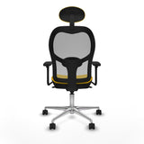 The office chair with headrest 3D086N1 from Piqueras y Crespo is an ergonomic and functional solution designed to withstand intensive work shifts, even up to 24 continuous hours. This model features a fixed headrest that provides extra support for the neck and head, while the fixed backrest ensures stability and comfort during use. Its structure includes a polished aluminum five-star base with a diameter of 720 mm, paired with 65 mm nylon wheels that allow smooth and quiet movement. It stands out for its adjustable 3D arms, which enable height and position changes to offer personalized support that reduces shoulder and neck strain. Additionally, it has a synchronised mechanism with five-position adjustment that synchronizes the backrest and seat movement, promoting healthy postures and greater comfort. The chair features an adjustable seat height ranging from 48 to 61 cm and a total height varying between 121 and 129 cm, adapting to different users and spaces. The seat interior is reinforced with a PVC frame and injected polyurethane foam with suitable density and thickness to ensure lasting comfort. The design combines mesh and fabric in yellow, providing a breathable finish that improves ventilation and reduces heat buildup, ideal for long sessions. It also supports up to 120 kg, making it robust and reliable for any professional environment. Certified under UNE-EN-1335, this chair is a solid choice that integrates technical innovation and ergonomics in a modern, functional design, ideal for those who need a durable, adjustable, and comfortable office chair for intensive use.