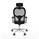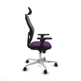 The office chair with headrest 3D086N2 by Piqueras y Crespo is designed for those who need a balance of ergonomics, durability, and comfort in professional, intensive-use environments. This office chair is built to withstand continuous shifts of up to 24 hours and a maximum weight of 120 kg, ensuring long-lasting performance. It features an adjustable and height-regulated seat, allowing seat height adjustment between 48 and 61 cm, providing excellent adaptability for different users and workstations. The backrest includes a 2D adjustable headrest and an adjustable lumbar support to offer optimal neck and lower back support, essential for maintaining correct posture and preventing discomfort during long sitting periods. Additionally, this chair has 3D armrests, which can be adjusted in height and angle, providing personalized ergonomic support. Its synchro mechanism with up to five positions allows reclining the backrest and adjusting the overall tilt, enhancing comfort during use. The seat and backrest are made with breathable mesh and fabric that ensure optimal ventilation, preventing heat and moisture buildup, contributing to a fresh feeling throughout the day. The frame includes a polished aluminum five-star base with a diameter of 720 mm, combined with 65 mm nylon casters that guarantee smooth and silent movement in any workspace. The seat incorporates high-density injected foam (50 mm thick and 50 kg/m³) that provides lasting comfort and firm support, along with a durable plastic outer cover. All this comes in a modern purple design that adds a distinctive touch while remaining practical and easy to clean. The chair complies with UNE-EN-1335 standards, certifying its quality and user safety. In short, the 3D086N2 model offers a robust and ergonomic solution for demanding work environments, delivering precise adjustments, breathable materials, and a design focused on postural health and office wellbeing.